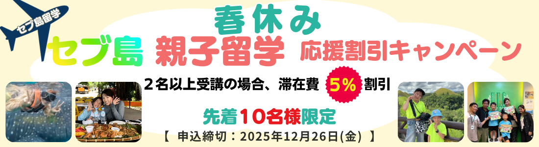 当校の親子留学プログラムにご参加いただいた生徒様が、セブでの留学生活をブログで詳しく紹介されています🌺 リアルな体験談がたくさん! これから留学をお考えの方は、ぜひ参考に […]