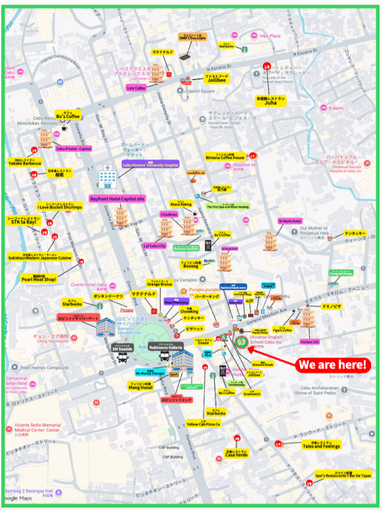 当校はセブ市の中心地に立地している学校ですので、朝から19時くらいまでは、人通りが多くとても安全です。学校の周辺にはデパートやレストラン、スパ、マッサージ店などが多く立ち並び、安全にセブ島での留学生活を送ることができます。2012年より営業しておりますが、スリやひったくりの生徒様への被害は1件もありません。昨年当校の入っているJESA IT CENTERの目の前にに警察の巡回拠点が出来ました。そのため、8:00-19:00くらいまで路上の客引き行為はなくなり、物乞いやストリートチルドレンの数も2012年に比べ、ほとんどいなくなりました。スタッフも毎日ジプニーで通勤しています。
