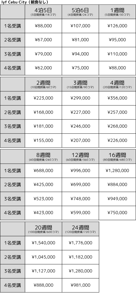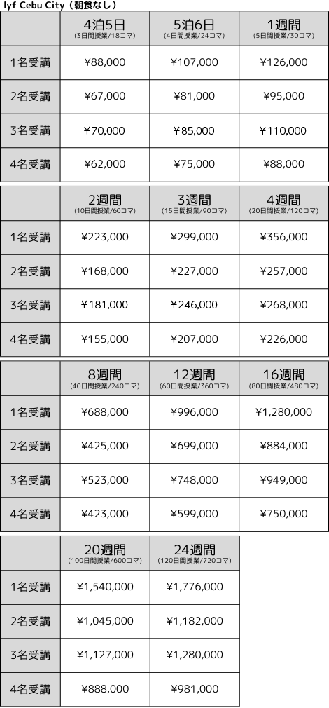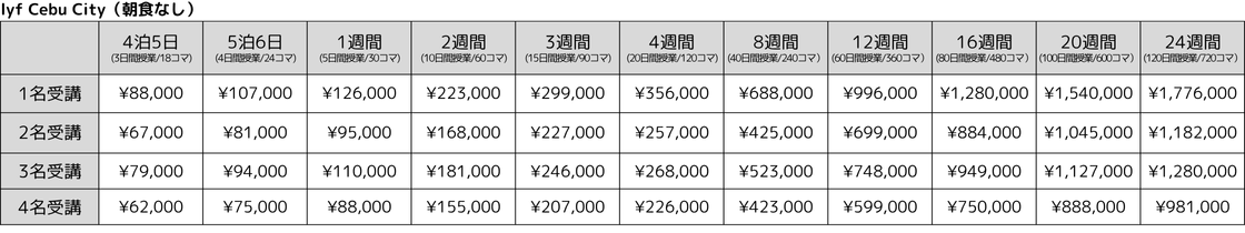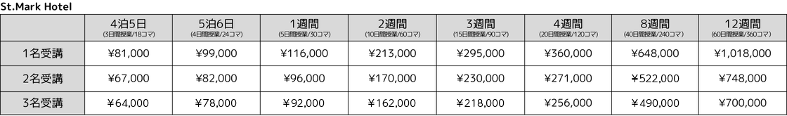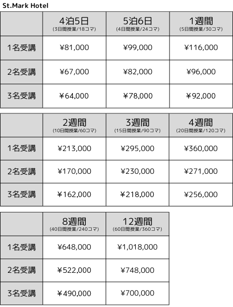 *2週間コースの場合、1日6時間×10日間=60時間のプライベートレッスン費用、13泊14日の宿泊費が含まれております。