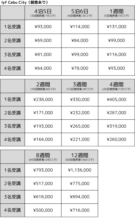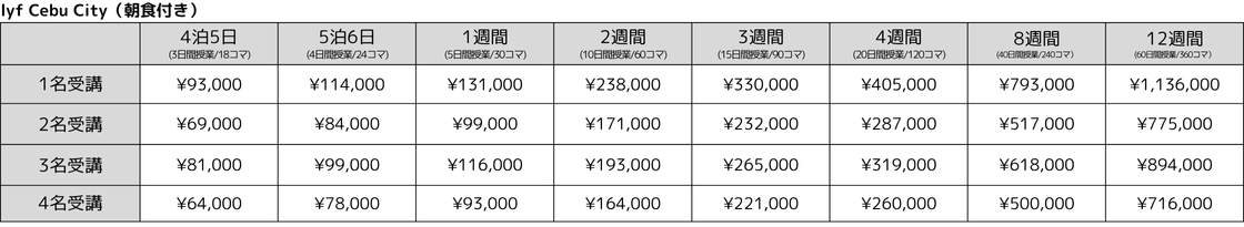 (春休み期間、夏休み期間は午前または午後の1日4時間のプライベートレッスンに変更、課外授業が午後2時間→午前または午後4時間に変更) - 宿泊費