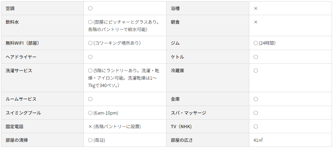 プール、ジム、キッズコーナー、リモートワークにも対応できる共用スペースがあり、仕事や勉強にも集中できる環境が整っています。また、5階にはランドリーエリアがあり、洗濯・乾燥・アイロンが可能です(1〜7kgで340ペソ)。